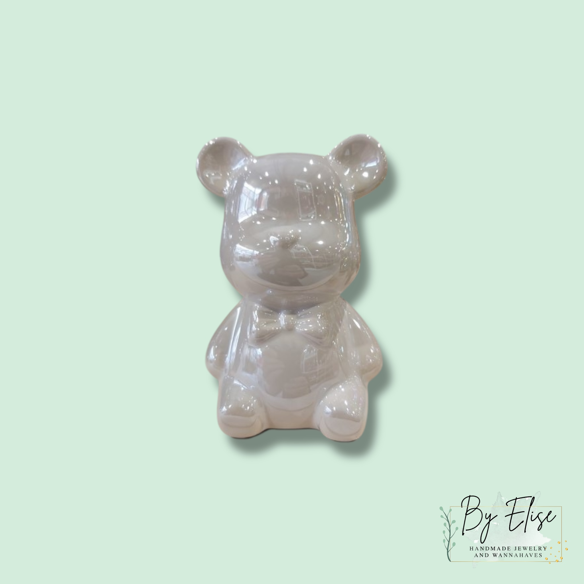 De bow tie beertjes zijn gemaakt van keramiek, ca. 12 cm hoog en zijn leverbaar in het zwart, goud, wit, roze en rainbow.